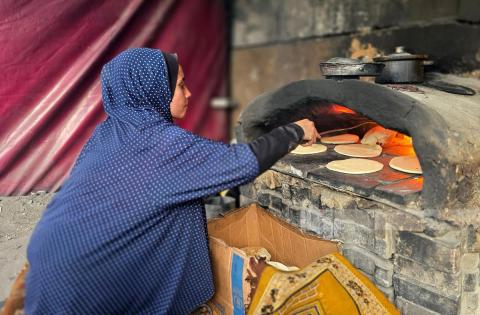 Caption: A Palestinian woman bakes bread during the holy month of Ramadan using a caly oven.