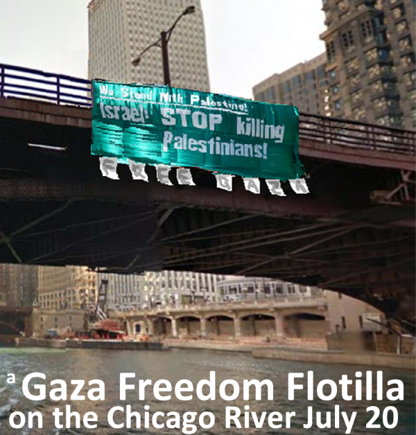 The three days will culminate with a Free Gaza Freedom Flotilla in the Chicago River on Saturday, July 20. Electric boats and kayakers will be in the Chicago river at 11am holding signs "Free Gaza" and "End the Blockade." A shore presence will support the boaters by holding signs and distributing informational flyers about Gaza to the public.